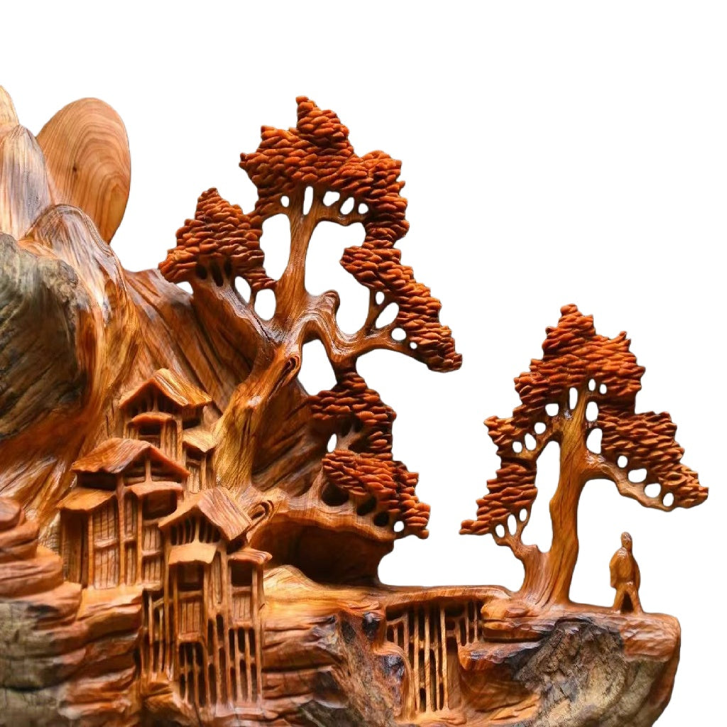 天然木に山水風景と伝統的な建築を精巧に彫り込んだ工芸品です。職人の手作業により、自然の造形を生かした奥行きのある仕上がりとなっています。室内装飾やコレクションとしてお楽しみください。