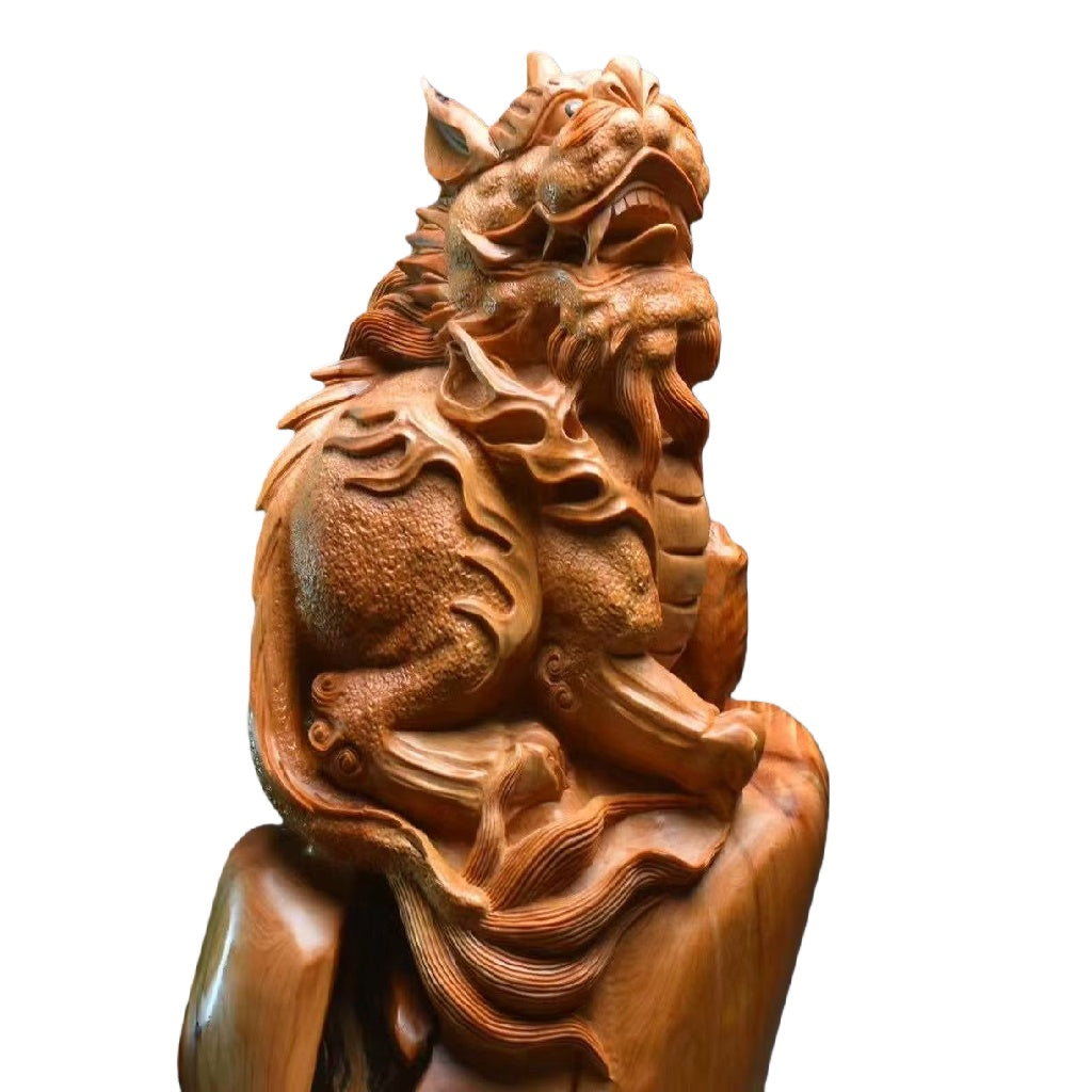重厚感のある天然木を贅沢に使用し、瑞獣として知られる「貔貅(ひきゅう)」を熟練の職人が力強く彫り上げた工芸品です。高さ61cmの堂々とした佇まいは、玄関やリビングの装飾として圧倒的な存在感を放ちます。